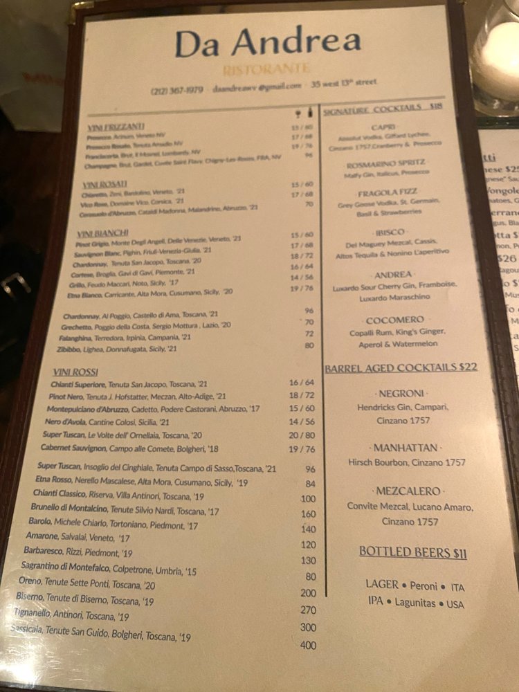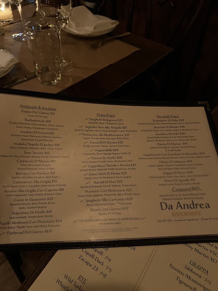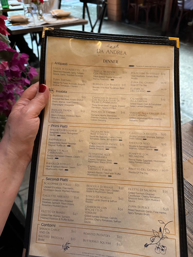 Da Andrea, a Mediterranean-Italian gem located in New York City, offers a diverse menu with vegan and vegetarian options. The restaurant provides a cozy and warm atmosphere, perfect for a nice dinner with friends or family. Customer reviews praised the quick service, well-seasoned dishes, and attentive staff. Standout dishes include the mushroom chicken plate, salmon pasta, calamari, Linguine Alla Carbonara, and Tiramisu. The seafood stew was particularly lauded for its amazing flavor and generous portion. The restaurant's outdoor seating with a flower trellis adds to the romantic ambiance. Experienced servers like Tatiana provide excellent recommendations and ensure a memorable dining experience. Da Andrea's commitment to sustainability is reflected in their use of plastic-free packaging and reusable tableware. Overall, Da Andrea is a must-visit for delicious Mediterranean-Italian cuisine served with love and care.